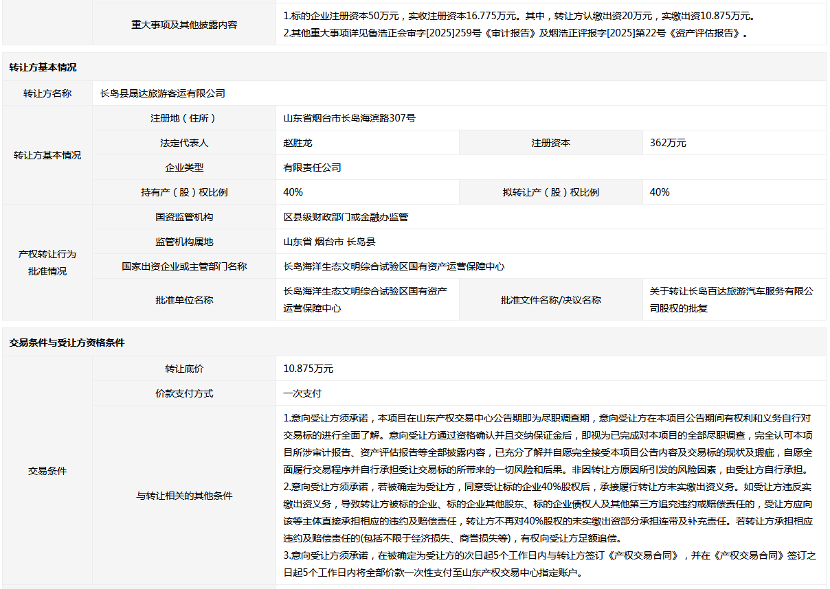 長(zhǎng)島百達(dá)旅游汽車服務(wù)有限公司40%國有股權(quán)