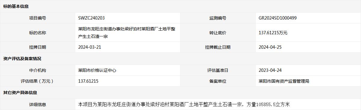 萊陽(yáng)市龍旺莊街道辦事處梁好泊村萊陽(yáng)酒廠土地平整產(chǎn)生土石渣一宗