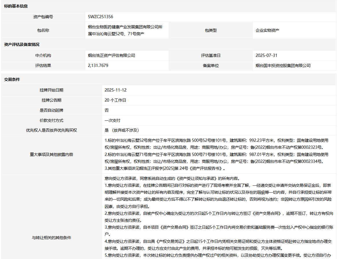 煙臺生物醫(yī)藥健康產業(yè)發(fā)展集團有限公司所屬中冶沁海云墅52號、71號房產