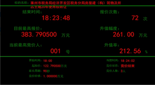 近日,萊州市稅務(wù)局經(jīng)濟(jì)開發(fā)區(qū)稅務(wù)分局所屬房屋建筑物及所占土地20年使用權(quán)轉(zhuǎn)讓項(xiàng)目在煙臺產(chǎn)權(quán)掛牌并有多個意向受讓方報(bào)名,最終,經(jīng)過72輪激烈報(bào)價(jià),項(xiàng)目較掛牌底價(jià)122萬元,增值261萬元,增值率高達(dá)212.56%,不但保證了疫情期間國有產(chǎn)權(quán)業(yè)務(wù)的正常開展,而且?guī)椭a(chǎn)權(quán)持有人實(shí)現(xiàn)了價(jià)值最大化。