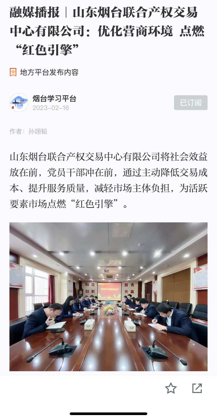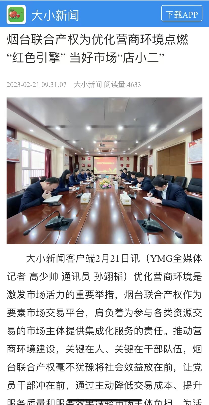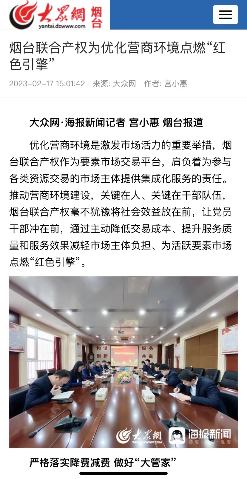 近日,“學(xué)習(xí)強(qiáng)國”煙臺平臺、煙臺日報(bào)社大小新聞網(wǎng)、大眾網(wǎng)煙臺刊發(fā)署名文章《煙臺聯(lián)合產(chǎn)權(quán)為優(yōu)化營商環(huán)境點(diǎn)燃“紅色引擎”當(dāng)好市場“店小二”》,全面介紹了2022年煙臺聯(lián)合產(chǎn)權(quán)作為要素市場交易平臺,肩負(fù)著為參與各類資源交易的市場主體提供集成化服務(wù)的責(zé)任,在推動(dòng)營商環(huán)境建設(shè)方面,毫不猶豫將社會效益放在前,讓黨員干部沖在前,通過主動(dòng)降低交易成本、提升服務(wù)質(zhì)量和服務(wù)效果減輕市場主體負(fù)擔(dān)、為活躍要素市場點(diǎn)燃“紅色引擎”。